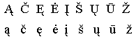 The main Lithuanian alphabet consists at the Latin alphabet (excluding Q, q, W, w, X, x) with extra 18 letters with diacritics (9 capital and 9 small):