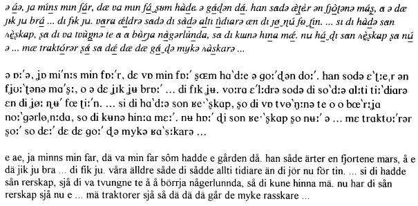 transcript written with the Swedish dialect alphabet; in the middle, the same