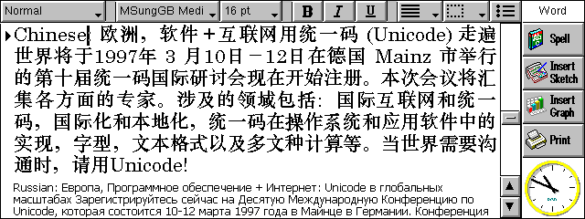 As a way of getting started I shall show you some non-Latin scripts on EPOC and discuss what is happening. Then we can look at how we got there. (The screen shots are of the EPOC emulator running on Microsoft Windows NT; it is identical in almost every respect to EPOC running on an target device-an actual palmtop or smartphone.)