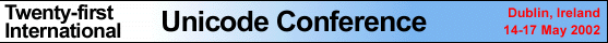 | The Internet and the World Wide Web continue to change the shape of computing. The goal of network computing and understandable text access across wide, diverse groups of people has brought great momentum to computing environments that build Unicode into their foundation. Whether it's Internet commerce, network access to data, or highly portable applications, Unicode makes a solid foundation for the network, global enterprises, and software users everywhere. The Twenty-first International Unicode Conference (IUC21), held on 14-17 May 2002 in Dublin, Ireland, addressed topics ranging from Unicode use in the World Wide Web and in corporate and government Intranets and databases, to the latest developments with Unicode 3.2, Java, XML and Web protocols. The four-day Conference was packed with three tracks of tutorials and presentations. Did you miss important talks due to clashes between tracks? Did you miss the Conference entirely? You'll have another opportunity at the Twenty-second International Unicode Conference in September 2002. See you there! |