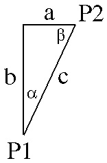The distance a which the umlaut must be moved rightward is c × sin α. To find that, first solve for c, the distance from P1 to P2, where P1 is the origin of the base bounding rectangle and P2 is the lower left corner of the umlaut glyph. The formulae follow: