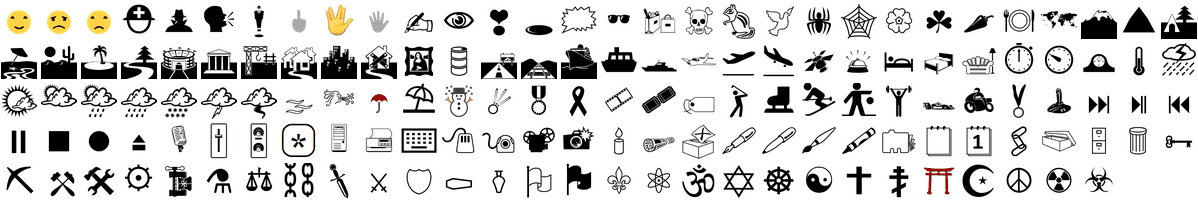 The images in the Chart Glyph column below are black and white versions for the Unicode charts. Vendors that support emoji should provide a colorful appearance for each of these. The samples in the Sample Colored Glyph column below use a variety of different styles to show some possible presentations. These are only illustrative samples; vendor images may vary.