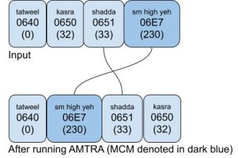 AMTRA is able to handle the special ligation of kasra and kasra-like characters which are ligated with a shadda or hamza in some styles and appear just below them instead of below the base letter; they still logically follow the shadda or hamza.