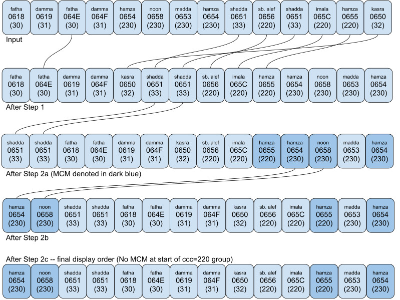 In Unicode, the Arabic script combining marks include eleven different non-zero Canonical_Combining_Class values, as shown in Table 1. When a combining character sequence includes marks from more than one of these classes, the rendering system has to determine a display order in which to position these marks on the base character.