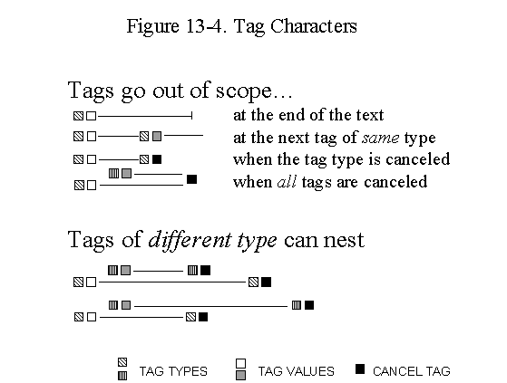 Processing. Sequential access to the text is generally straightforward. If language codes are not relevant to the particular processing operation, then they should be ignored. Random access to stateful tags is more problematic. Because the current state of the text depends upon tags previous to it, the text must be searched backward, sometimes all the way to the start. With these exceptions, tags pose no particular difficulties as long as no modifications are made to the text.